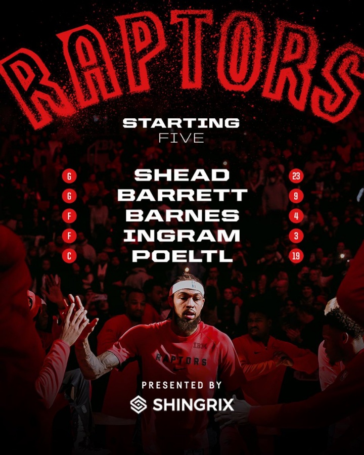 猛龙方面:贾马尔·谢德、布兰登·英格拉姆、RJ·巴雷特、斯科蒂·巴恩斯、雅各布·珀尔特尔